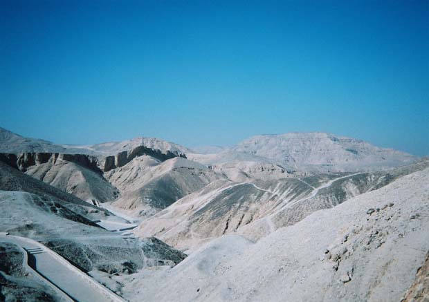 【王家の谷】 この谷のあちこちに、お墓があります。 一番の見所は、もちろんツタンカーメンのお墓、いまでもツタンカーメンのミイラは、そのままお墓に眠っています。 写真を撮るために、ここまで上るのは大変でした。信じられないと思うけど、下から歩いて上がったんだよ。 ここまで来ると観光客(人)は誰もいません。ちょっと怖い!